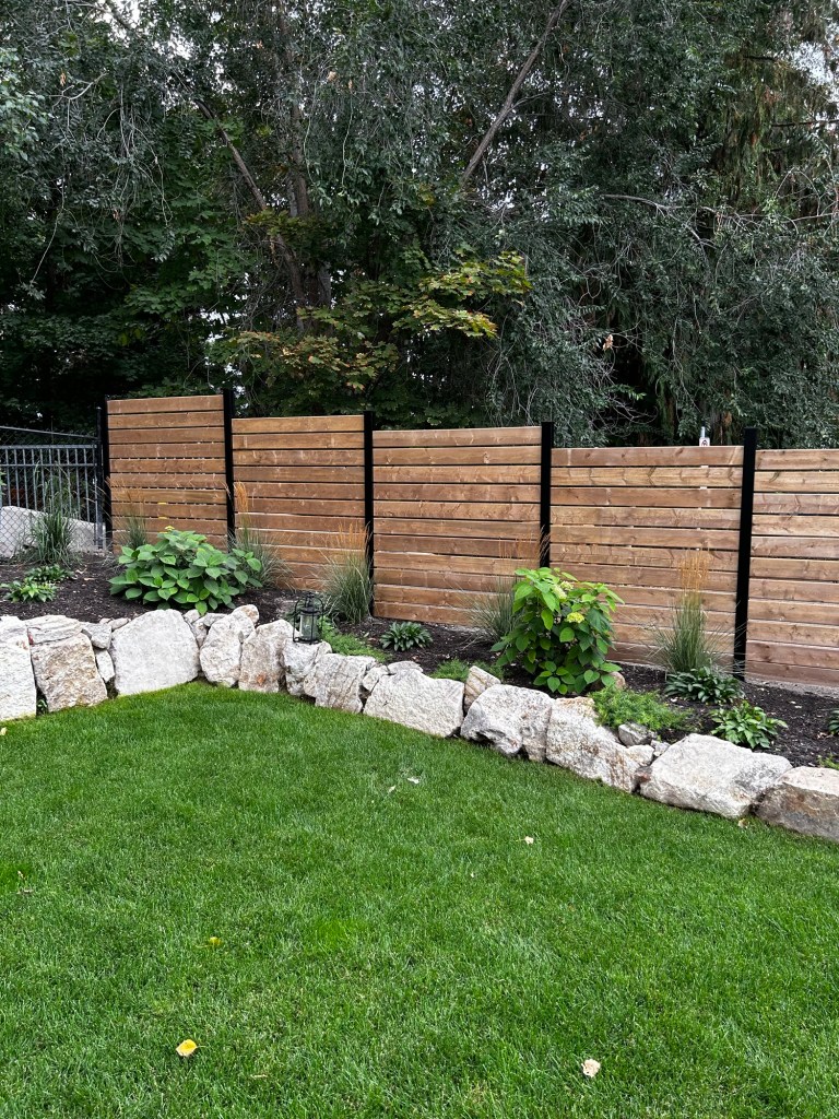 Modern and durable, horizontal rail fencing with metal posts offers a clean, stylish look with added strength and longevity. While maintaining a warm, residential appearance—making it a great low-maintenance option for homeowners who want both style and durability.